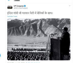 చిత్రాన్ని యూపీ కాంగ్రెస్ అధికారిక ట్విట్టర్తో పాటు.. యూత్ కాంగ్రెస్ ట్విట్టర్ ఖాతా నుంచి పోస్ట్ చేశారు. అంతేకాదు.. ఇతర కాంగ్రెస్ సీనియర్ నేతలు దానిని రీట్వీట్ చేయడంతో పాటు.. షేర్స్ చేస్తున్నారు. గతంలో భారత సైనికులనుద్దేశిస్తూ గాల్వన్ లోయలో మాజీ ప్రధాని ఇందిరా ప్రసంగం చేశారని పోస్ట్ చేశారు. ఇది ఆదివారం నుంచి తెగ వైరల్ అవుతోంది.