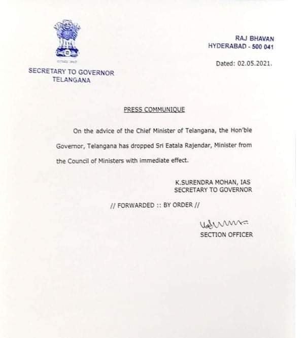 సీఎం కేసీఆర్ ఈటల రాజేందర్కు బిగ్ షాకిచ్చారు. ఇప్పటికే ఆరోగ్య మంత్రిత్వ శాఖ నుంచి తొలగించిన విషయం తెలిసిందే. ఇక ప్రస్తుతం ఎలాంటి శాఖ లేకుండా కేవలం మంత్రిగా ఉండిపోయిన ఈటలను.. మంత్రి వర్గం నుంచి తొలిగించారు. సీఎం కేసీఆర్ సూచన మేరకు రాష్ట్ర మంత్రివర్గం నుంచి ఈటల రాజేందర్ను బర్తరఫ్ చేస్తూ గవర్నర్ నిర్ణయం తీసుకున్నారు. ఈ నిర్ణయం తక్షణమే అమల్లోకి వస్తుందని గవర్నర్ కార్యాలయం పేర్కొంది.